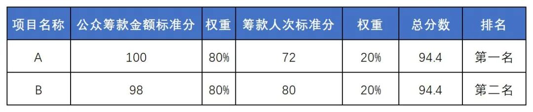 一、统计时间:2020年9月7日9:00至9月9日23:59三、计算公式:公众筹款金额标准分*80%+筹款人次标准分*20%+附加分(国务院扶贫办挂牌督战县、深圳市对口支援地区、三区三州,参评项目主体来源以上地区范围的给予附加分6分)1.标准分,是一种由原始分推导出来的相对地位量数,它是用来说明原始分在所属的那批分数中的相对位置的。大赛组委会将根据99公益日期间项目方筹款金额和筹款人次两个维度实际后台数据进行第一次排名,然后以总分100分,标准差2分(即第一名100分、第二名98分....第50名2分)进行计分。最后,将筹款金额标准分×80%,加上筹款人次标准分×20%,再视项目情况给予附加分,得到最终分数和排名。 2.如有同分,按分数权重比,筹款金额低者后退一名,其余项目排名顺延。举例:以下A、B项目分数相同,但B项目筹款金额标准分低于A,故B的排名比A后退一名。2020年中国公益慈善项目大赛资源联动奖参与项目名单